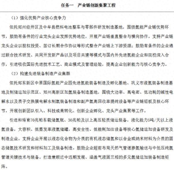 規劃提到重點發展任務:聚焦副產氫提純、堿性電解水制氫、質子交換膜電解水制氫、甲醇制氫、氨裂解制氫、生物質制氫等核心技術裝備及關鍵零部件,發揮中原國際氫能產業園孵化器與加速器功能,支持有條件的氫能產業初創公司和中小企業做大做強,積極引進國內外創新創業團隊和領先企業,推動國際先進制氫技術在鄭州市實現成果轉化,打造規模化的制氫裝備產業集群。建立中原氫能交易平臺,重點開發氫產品交易、氫價格資訊等主要功能,積極打造立足全國的氫產品交易中心、信息資訊中心、價格指數中心、資源調配中心。推進鄭州與各氫能示范重點城市群之間高質量協同,依托京港澳、連霍高速網絡和國道107、310骨干公路,開展跨區域陸港聯運物流集散貨運氫能示范,探索鄭州—河北,鄭州—山東,鄭州—上海的城際氫能貨運物流廊道建設。到2025年累計推廣燃料電池車輛不少于2500輛。鼓勵產業鏈龍頭企業聯合高校和機構共同創建國家重點實驗室,支持設立氫能院士工作站,推動建設省部級工程研究中心和工程技術研究中心、企業技術中心、企業工程實驗室等科研創新平臺。