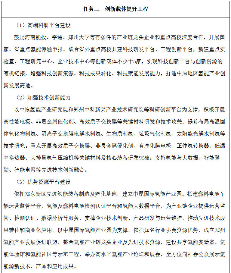由市政府牽頭,集聚產業優勢資源,在鄭東新區打造氫能產業集聚中心。設立中原氫能產業研究院,承擔氫能產業政策研究、產業發展規劃、前沿技術跟蹤、科研成果孵化、示范項目管理、對外交流合作等職能;建設中原國際氫能產業園,開展產學研聯合技術攻關,孵化培育、定向招商引進具有核心技術和創新能力的龍頭企業,推進產業鏈協同發展和實現規模聚集效應;成立氫能產業應用基金,重點為中原國際氫能產業園科技成果孵化、運營平臺建設、現有氫能企業發展和氫能產業招引提供資金支持。