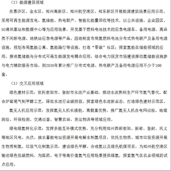示范應用到2030年,氫能在交通運輸領域的示范應用影響力顯著提升,以鄭州市為引領,帶動中原城市群,擴大應用場景范圍和規模。立足西部地區,促進綠氫與化工領域深度融合,布局氫基綠色燃料示范項目。立足航空港國際航空物流中心,打造氫燃料電池物流車、叉車、無人機等應用場景。推廣燃料電池車輛不少于5000輛,推廣分布式電源、熱電聯產及備用電源應用不少于100套,建設氫農業示范田不少于100畝。