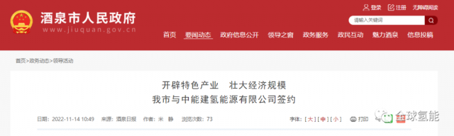 酒泉市人民政府14日官網消息,11月11日,甘肅酒泉市人民政府與中能建氫能源有限公司簽訂了《中能建甘肅酒泉風光氫儲及氫能綜合利用一體化示范項目投資合作協議》。