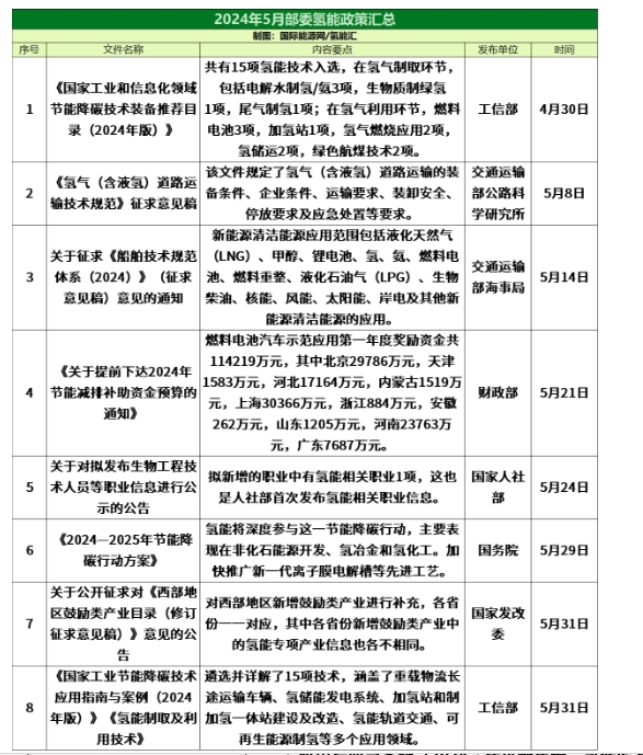 在4月30日,工信部發(fā)布《國家工業(yè)和信息化領(lǐng)域節(jié)能降碳技術(shù)裝備推薦目錄(2024年版)》,共有15項(xiàng)氫能技術(shù)入選;5月31日,工信部又發(fā)布了《國家工業(yè)節(jié)能降碳技術(shù)應(yīng)用指南與案例(2024年版)》《氫能制取及利用技術(shù)》中詳解了15項(xiàng)技術(shù),涵蓋了重載物流長(zhǎng)途運(yùn)輸車輛、氫儲(chǔ)能發(fā)電系統(tǒng)、加氫站和制加氫一體站建設(shè)及改造、氫能軌道交通、可再生能源制氫等多個(gè)應(yīng)用領(lǐng)域。