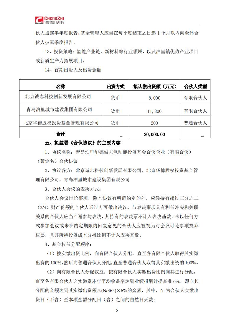 此外,青島泊里華德誠志氫動能投資基金合伙企業(yè)(有限合伙)(暫定名)合伙協(xié)議各方包括北京誠志科技創(chuàng)新發(fā)展有限公司、北京華德股權(quán)投資基金管
