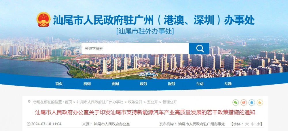 2024年7月10日,汕尾市人民政府印發《汕尾市支持新能源汽車產業高質量發展的若干政策措施》的通知。
