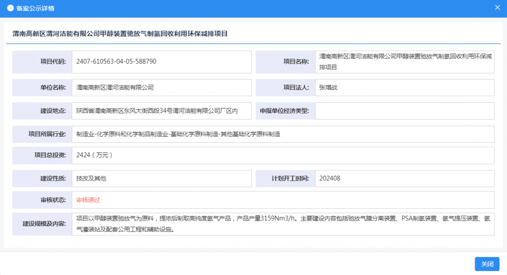 據悉,渭南高新區渭河潔能有限公司甲醇裝置馳放氣制氫回收利用環保減排項目位于陜西省渭南高新區東風大街西段34號渭河潔能有限公司廠區內,總投資2424萬元。
