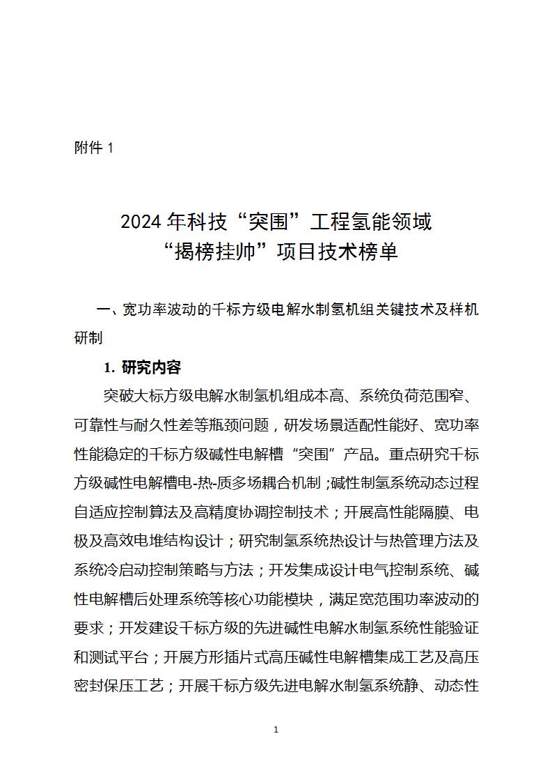 附件:1.2024年科技“突圍”工程氫能領域 “揭榜掛帥”項目技術榜單