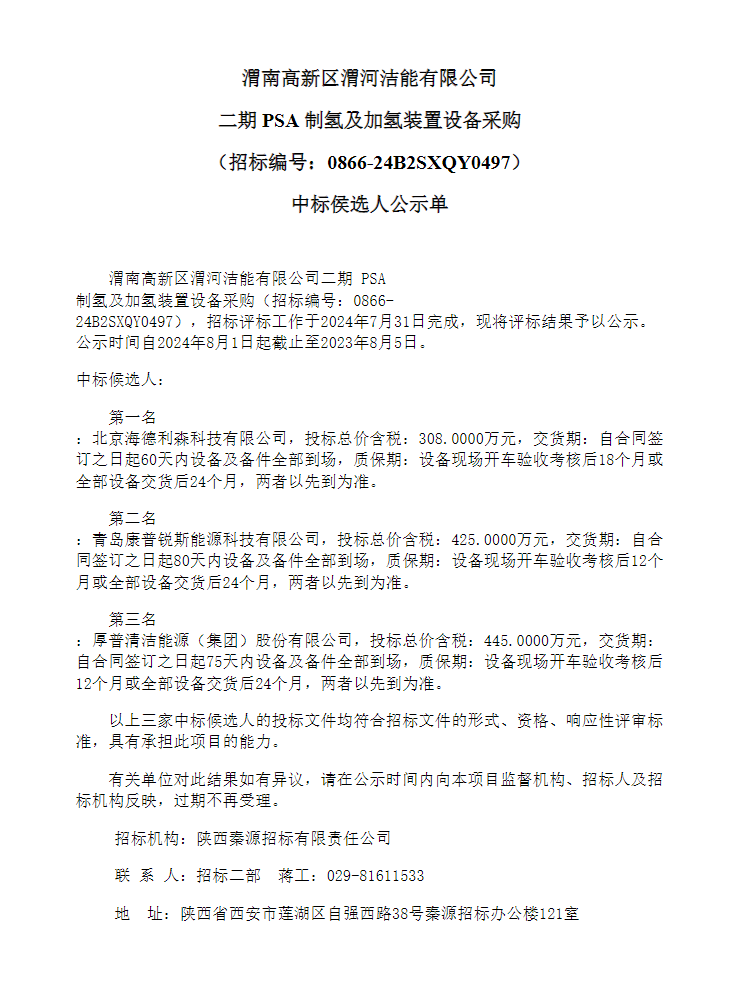 8月1日,渭南高新區(qū)渭河潔能有限公司二期PSA制氫及加氫裝置設(shè)備采購中標候選人公示。中標候選人第一名為北京海德利森科技有限公