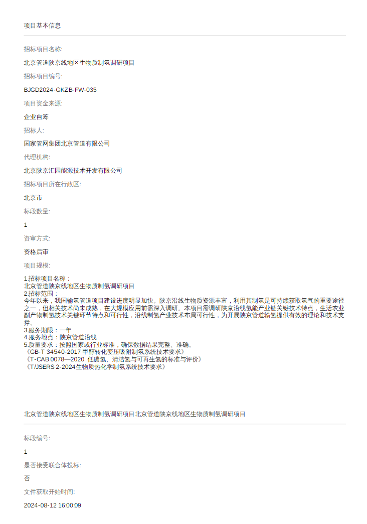 8月12日,北京管道陜京線地區(qū)生物質(zhì)制氫調(diào)研項(xiàng)目招標(biāo)公告發(fā)布,項(xiàng)目招標(biāo)人為國家管網(wǎng)集團(tuán)北京管道有限公司。