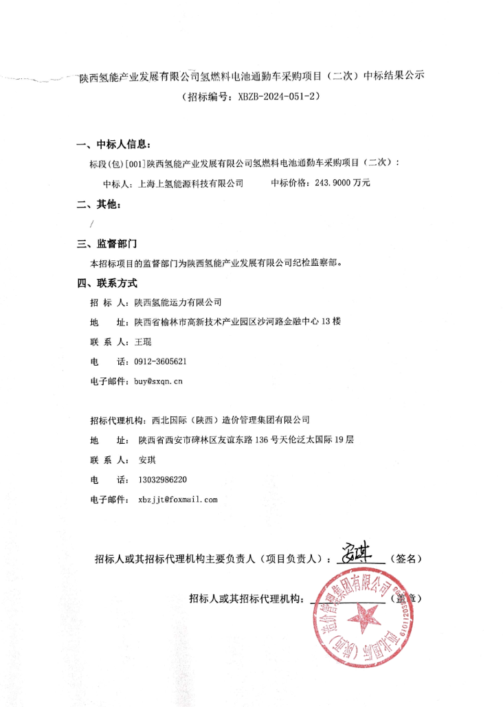 8月9日,陜西氫能產業發展有限公司氫燃料電池通勤車采購項目(二次)中標結果公示。招標人為陜西氫能運力有限公司,中標人為上海上氫能源科技有限公司,中標價格243.9000萬元。