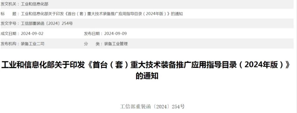 9月9日,工信部發布了《首臺(套)重大技術裝備推廣應用指導目錄(2024年版)》(以下簡稱《目錄》)。