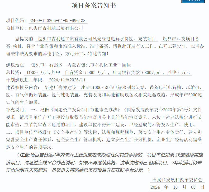 10月8日,內蒙古投資項目在線審批辦事大廳網站發布信息顯示,包頭市吉利通工貿有限公司提交的包頭市吉利通工貿有限公司風光綠電