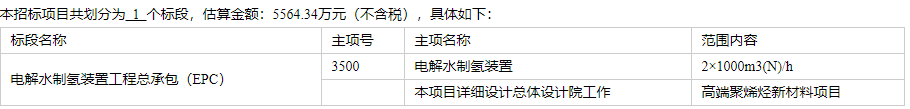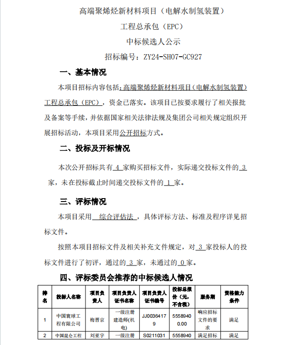 10月22日,高端聚烯烴新材料項目(電解水制氫裝置)工程總承包(EPC)中標候選人公示。中標候選人分別為中國寰球工程有限公司、