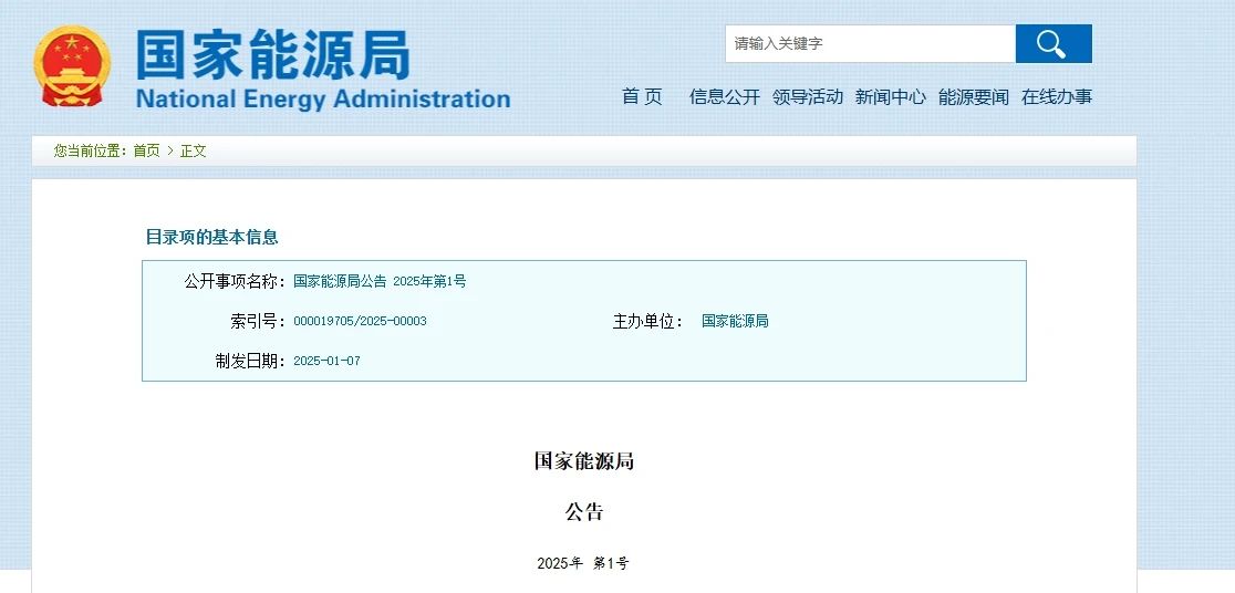 1月13日,國家能源局發布《2025年第1號》公告,公告提及:國家能源局組織了第四批能源領域首臺(套)重大技術裝備申報及評定并發