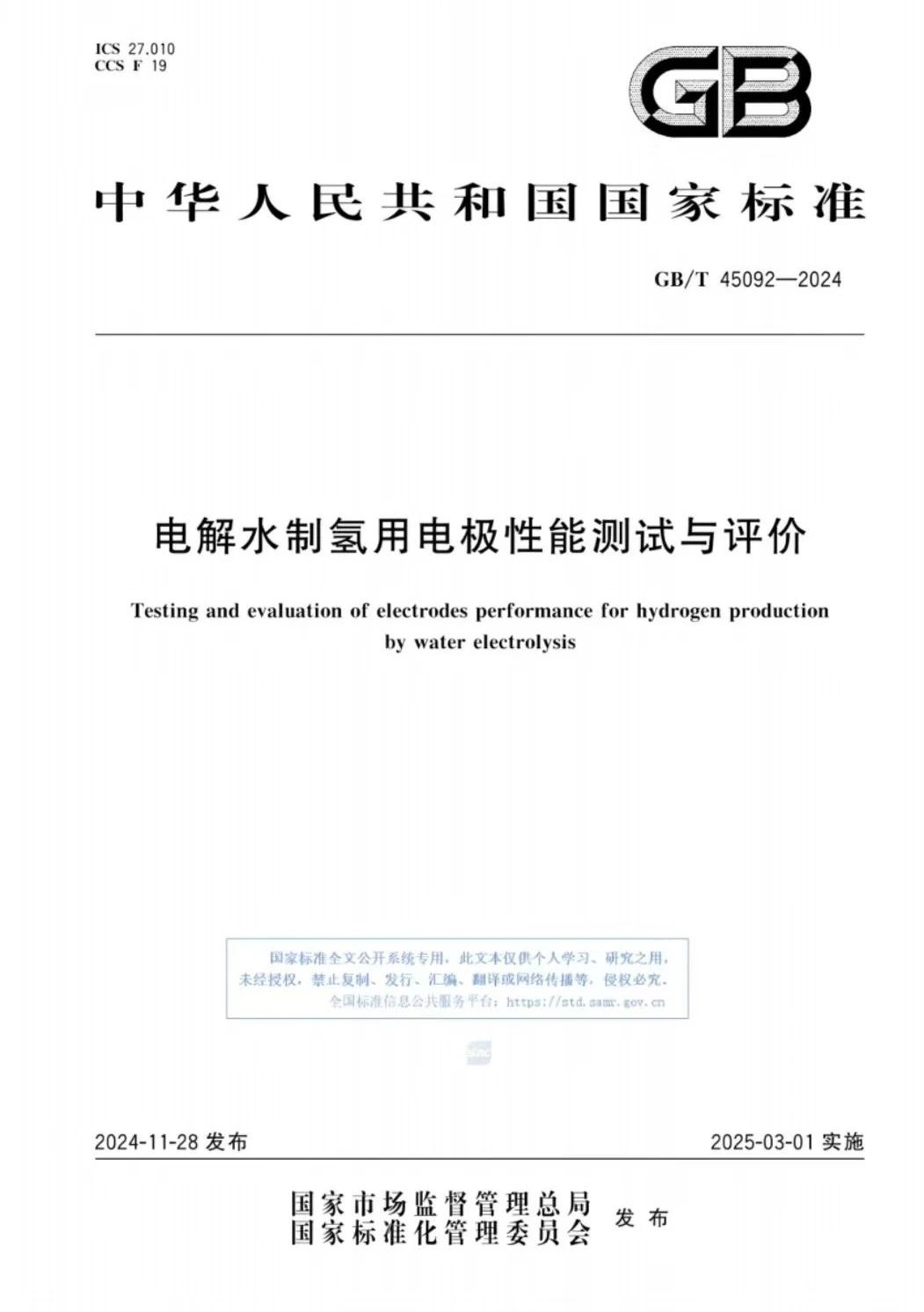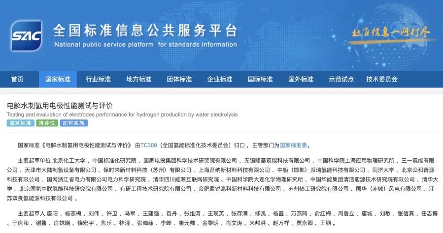 近期,由國家標準委主管,TC309(全國氫能標準化技術委員會)歸口的國家標準《電解水制氫用電極性能測試與評價》(GB/T 45092-2024)獲準發布,并將于2025年3月1日起實施。