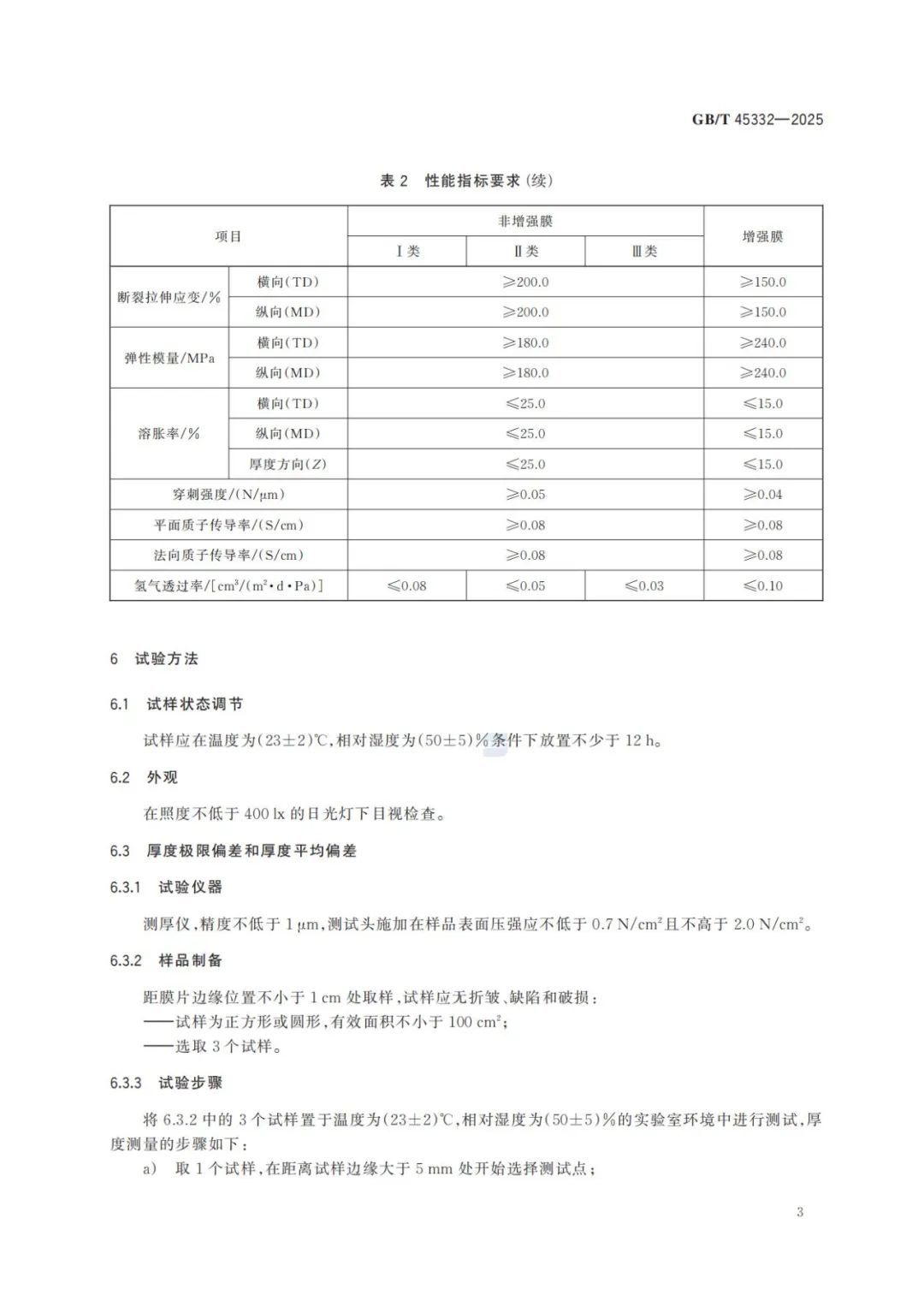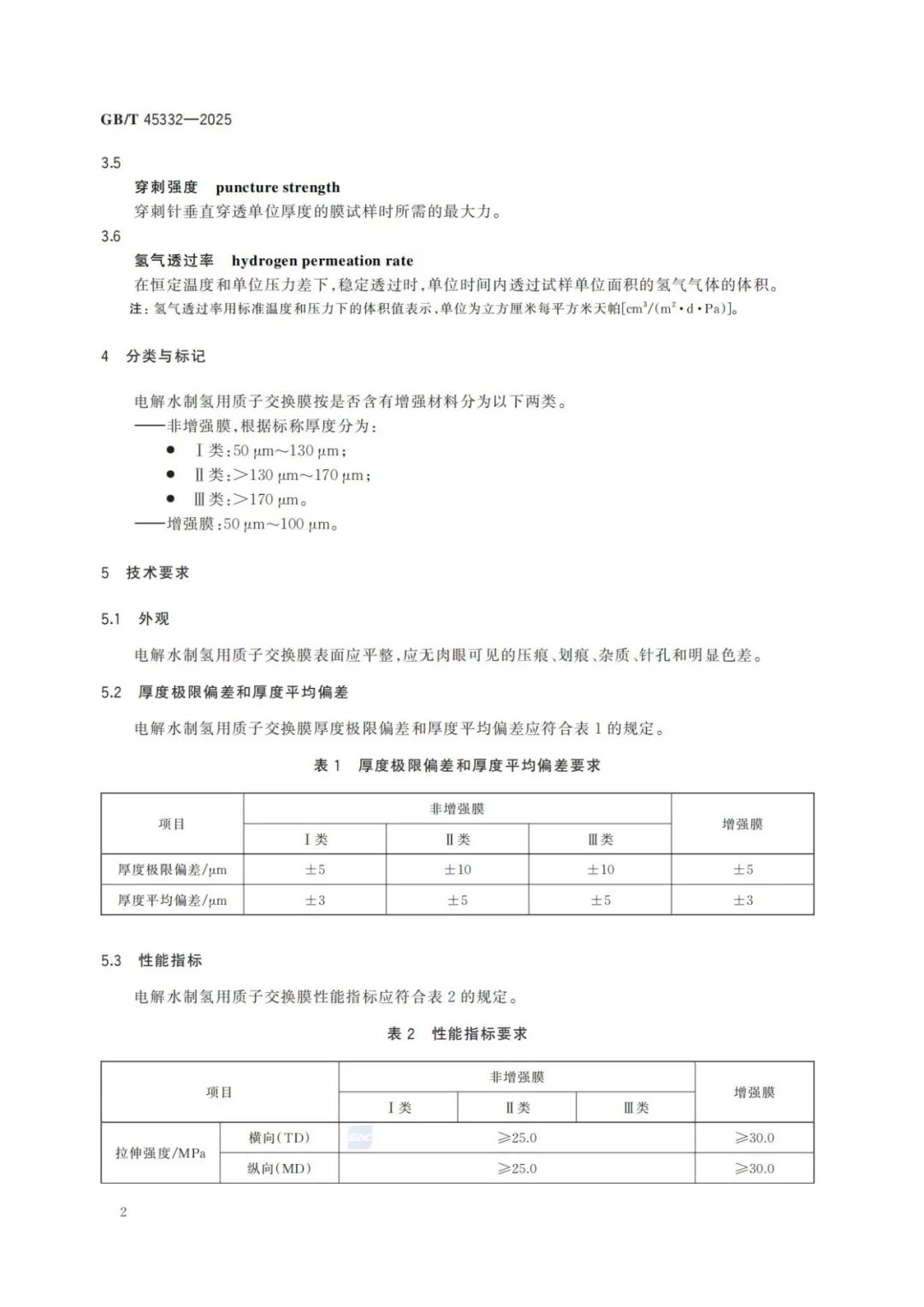 電解水制氫用質(zhì)子交換膜性能指標(biāo)應(yīng)符合表2的規(guī)定。