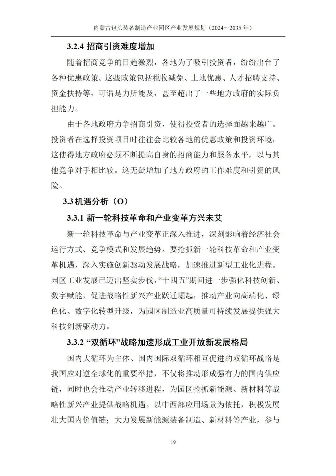 為進(jìn)一步適應(yīng)產(chǎn)業(yè)發(fā)展新趨勢(shì),推動(dòng)創(chuàng)新發(fā)展,提升園區(qū)整體競(jìng)爭(zhēng)力,2024年底,園區(qū)通過前期調(diào)研、多方征求意見及多次會(huì)議研討,結(jié)合當(dāng)前實(shí)際情況,修編了《包頭裝備制造產(chǎn)業(yè)園區(qū)產(chǎn)業(yè)發(fā)展規(guī)劃(2024~2035年)》,拓展了傳統(tǒng)裝備制造產(chǎn)業(yè)的發(fā)展思路,新增了新一代技術(shù)等新興產(chǎn)業(yè),現(xiàn)形成《規(guī)劃》征求意見稿,向社會(huì)征求意見,歡迎社會(huì)各界提出意見建議。