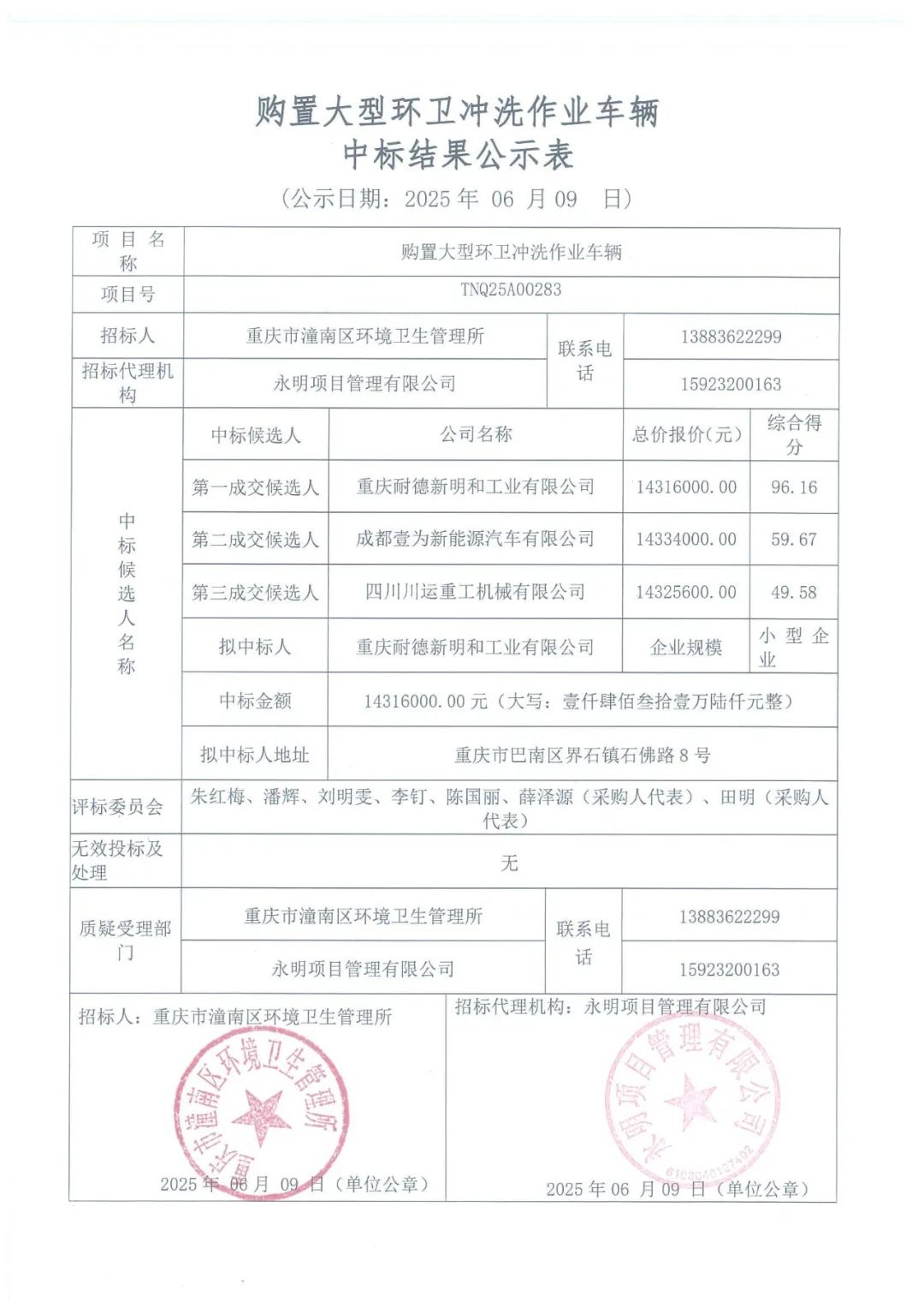 6月9日,購置大型環衛沖洗作業車輛(TNQ25A00283)中標(成交)結果公告。
