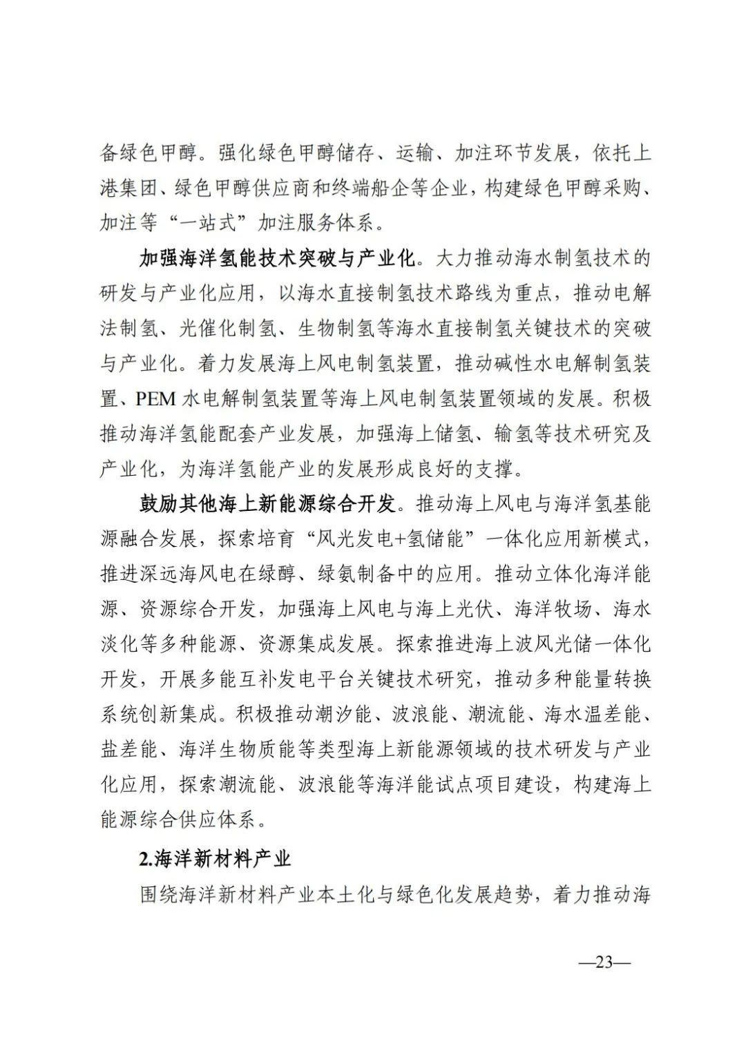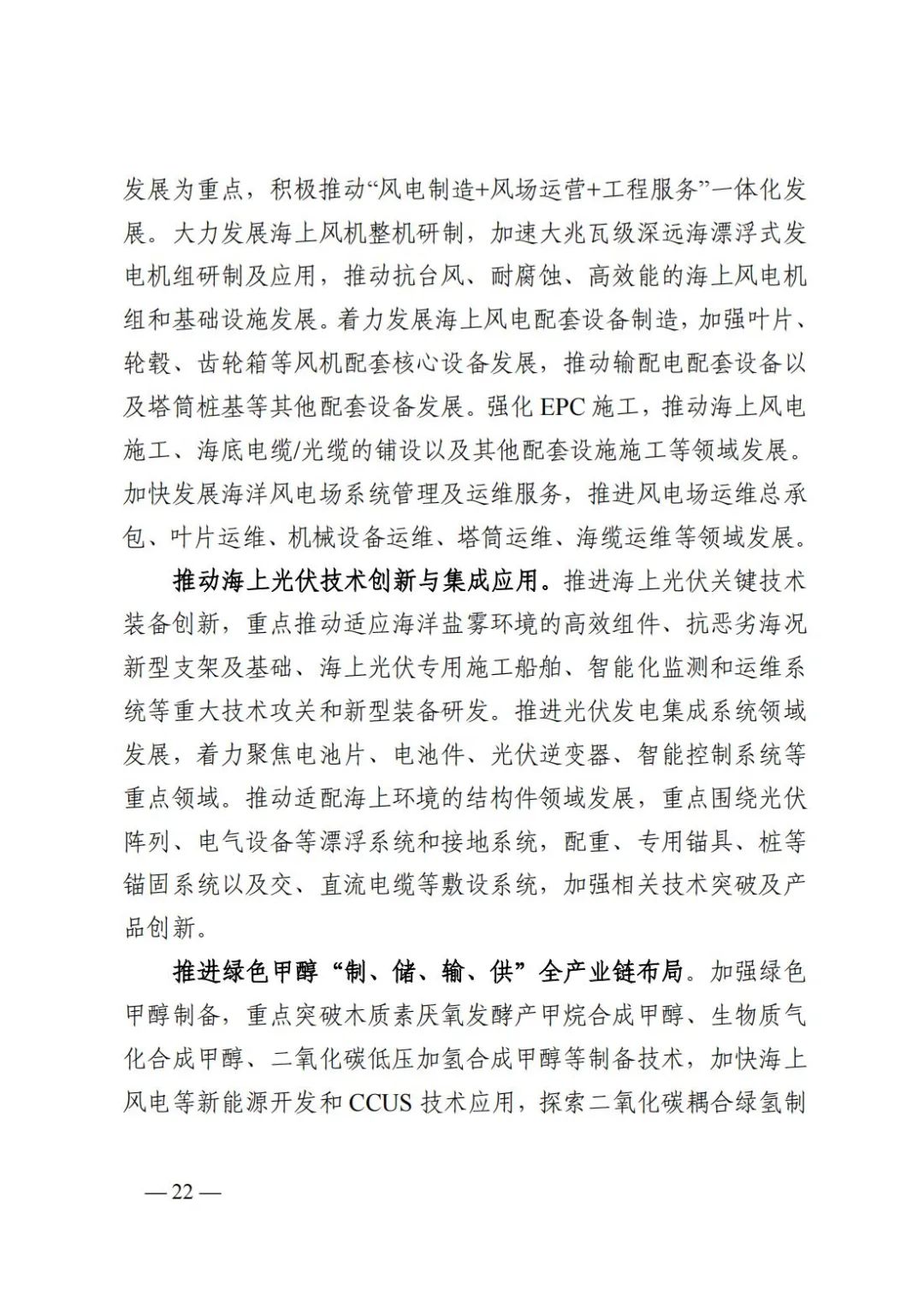 鼓勵其他海上新能源綜合開發。推動海上風電與海洋氫基能源融合發展,探索培育“風光發電+氫儲能”一體化應用新模式,推進深遠海風電在綠醇、綠氨制備中的應用。