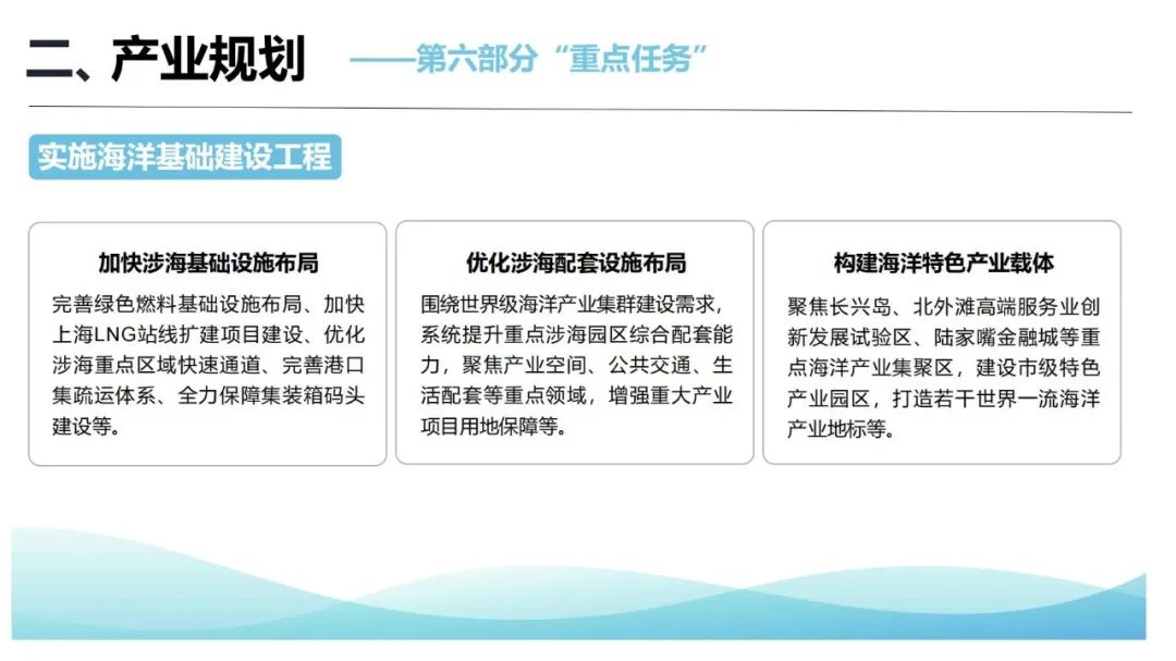 強化海洋新興產業應用場景牽引,推動金山海上風電場一期、深遠海風電示范項目等海上風電場建設;打造大規模海上光伏基地,推動東海大橋、臨港、金山、奉賢等海上光伏項目建設及并網投運;積極構建海洋氫能產業基地,打造世界級規模化深遠海風電制氫示范基地。
