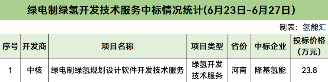 本周綠氫開發(fā)技術(shù)服務(wù)開發(fā)商有1家,為中核,中標企業(yè)為隆基氫能。