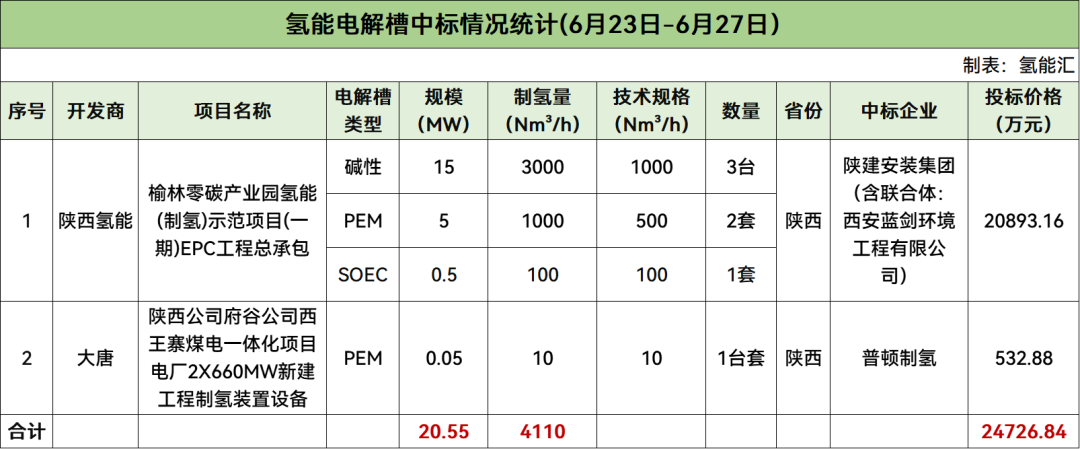 本周電解槽開發(fā)商有2家,為陜西氫能、大唐,中標企業(yè)為陜建安裝集團(含聯(lián)合體:西安藍劍環(huán)境工程有限公司)、普頓制氫。
