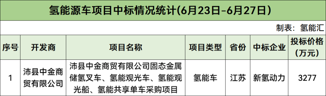 本周氫能源車開發(fā)商有1家,為沛縣中金商貿(mào)有限公司,中標企業(yè)為新氫動力。