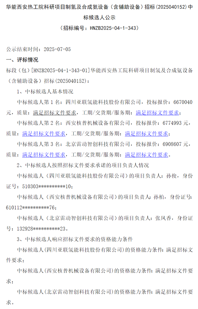 7月2日,華能西安熱工院科研項目制氫及合成氨設備(含輔助設備)招標(2025040152)]候選人公示。