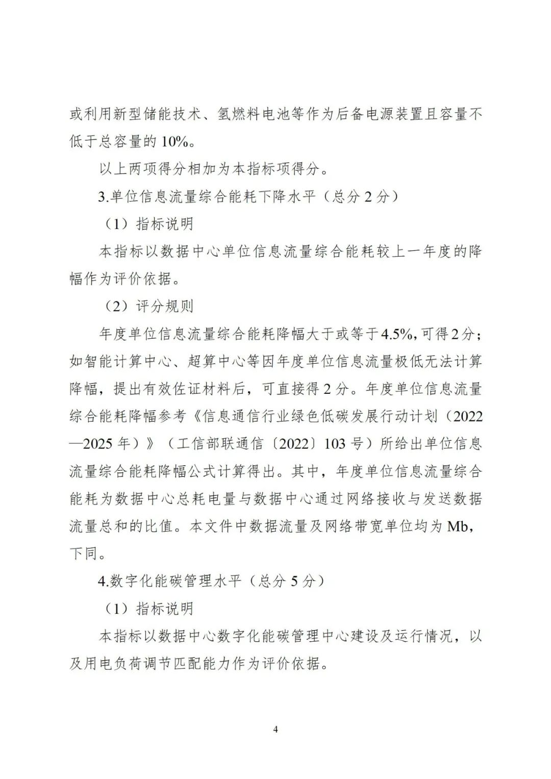 (四)數據中心原則上應達到《綠色數據中心評價》(GB/T 44989—2024)二級及以上等級。電能利用效率不高于1.30,達到《數據中心能效限定值及能效等級》(GB40879—2021)中的2級及以上水平。采用的服務器能效應達到《塔式和機架式服務器能效限定值及能效等級》(GB 43630—2023)等規定的節能水平及以上。風電、光伏等可再生能源利用率不低于數據中心所在省(區、市)可再生能源電力消納責任權重,積極利用儲能、氫能等技術,具有較強用電負荷調節匹配能力。