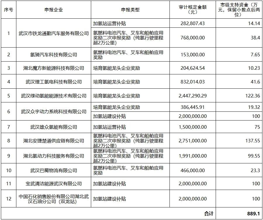 申報企業有武漢市鐵龍通勤汽車服務有限公司、氫騎汽車科技有限公司、湖北魔方新能源科技有限公司、武漢理工氫電科技有限公司、武漢綠動氫能能源技術有限公司、武漢眾宇動力系統科技有限公司、武漢雄眾氫能有限公司、湖北安捷楚道供應鏈有限公司、湖北氫動力科技服務有限公司、武漢巴蜀物流有限公司、寶武清潔能源武漢有限公司、中國石化銷售股份有限公司湖北武漢石油分公司(雙龍站)。