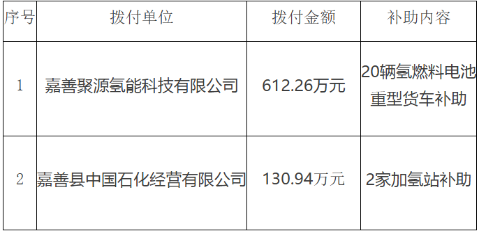 2家加氫站補助撥付單位為嘉善縣中國石化經營有限公司,撥付金額130.94萬元。