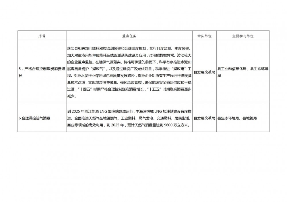 5.嚴格合理控制煤炭消費增長。推進煤炭消費減量替代和轉型升級,大力壓減非發電用煤消費。落實縣相關部門能耗雙控監測預警和會商調度機制,實行月度監測、季度預警。加大對重點用能單位能耗在線監測系統建設及應用,對用能數據異常、波動較大的企業重點監控。在確保氣源落實、價格可承受的前提下,科學有序推進水泥和燃煤自備鍋爐“煤改氣”,以及通過建設廠區光伏項目,科學推進“煤改電”工程。引導水泥行業謀劃綠色高質量發展路徑,指導企業對原有生產線進行煤炭減量技術改造,實現煤炭消費減量。強化風險管控,確保能源安全穩定供應和平穩過渡,“十四五”時期嚴格合理控制煤炭消費增長,“十五五”時期煤炭消費逐步減少。