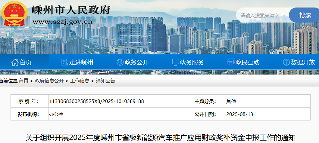 月13日,浙江嵊州市人民政府發布《關于組織開展2025年度嵊州市省級新能源汽車推廣應用財政獎補資金申報工作的通知》。文件指出,