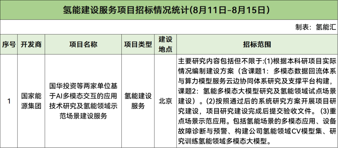 據統計,本周共1個氫能建設服務項目招標,項目為國華投資等兩家單位基于AI多模態交互的應用技術研究及氫能領域示范場景建設服務,招標人為國家能源集團。