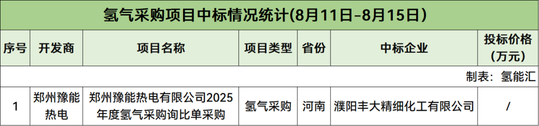 氫氣采購項目有1個,開發商是鄭州豫能熱電,中標企業為濮陽豐大精細化工有限公司。