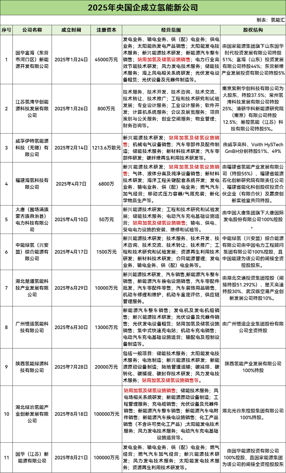 氫能匯了解到,截至目前,有11家央國企成立氫能新公司,央企涉及國家能源集團、中國大唐、中國能建。國企涉及湖北交通投資集團、廣州恒運集團、陜西氫能等。部分企業由國企間接控股。