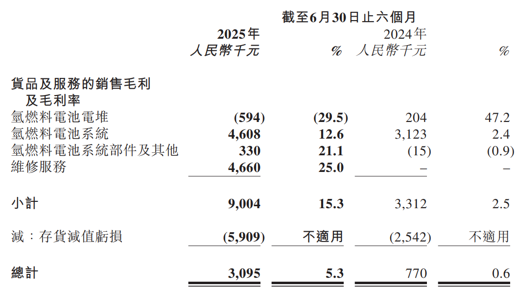 系統(tǒng)毛利回升10個(gè)點(diǎn)。國(guó)鴻毛利由過往期間的約人民幣0.8百萬元大幅增加301.9%至報(bào)告期間的約人民幣3.1百萬元,本集團(tuán)的毛利率由過往期間的約0.6%增加至報(bào)告期間的約5.3%,燃料電池系統(tǒng)毛利由往期2.4%回升至報(bào)告期間的約12.6%。主要是由于(i)報(bào)告期間本集團(tuán)氫能燃料電池系統(tǒng)進(jìn)入批量生產(chǎn)結(jié)算,單位銷售成本下降;(ii)報(bào)告期間,本集團(tuán)提供的氫燃料電池車輛維修服務(wù)毛利率較高。報(bào)告期間,本集團(tuán)氫燃料電池電堆負(fù)毛利主要是市場(chǎng)價(jià)格降幅較大所致。