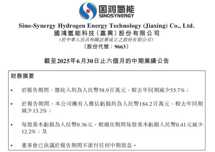 2025年8月25日,國(guó)鴻氫能發(fā)布中期業(yè)績(jī)公告,公告顯示,截至2025年6月30日止六個(gè)月,公司總收入約為人民幣5890萬元,較去年同期大幅減少55.7%;公司擁有人應(yīng)占虧損約為人民幣1.84億元,較去年同期減少13.2%;每股基本虧損為人民幣0.36元,較去年同期每股基本虧損人民幣0.41元減少12.2%。國(guó)鴻氫能在2025上半年延續(xù)了2024年?duì)I收下滑的趨勢(shì),反映出氫能行業(yè)商業(yè)化進(jìn)程仍面臨挑戰(zhàn),但虧損收窄表明公司在成本控制和運(yùn)營(yíng)效率方面取得一定進(jìn)展。
