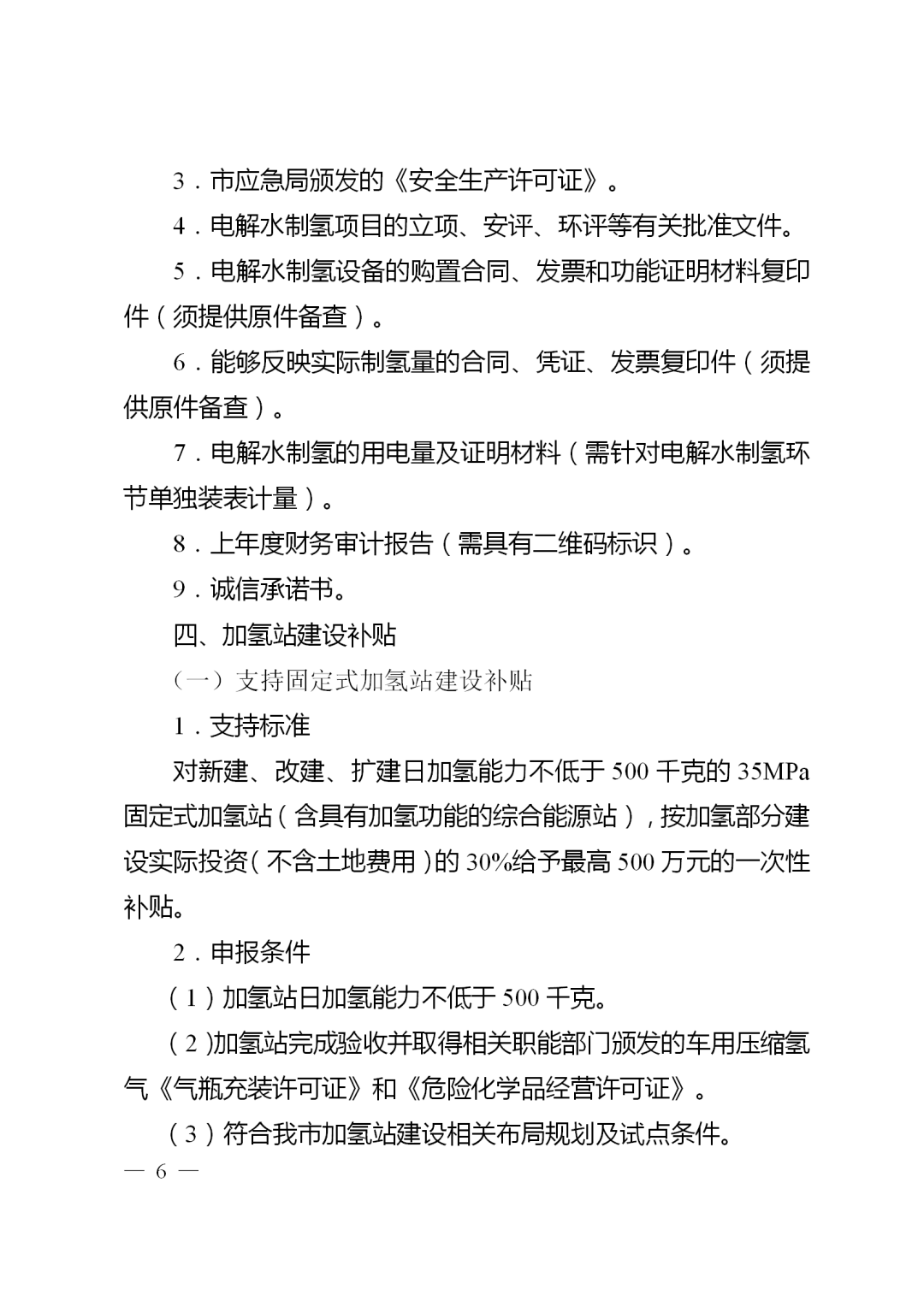 支持固定式加氫站建設補貼。對新建、改建、擴建日加氫能力不低于500千克的35MPa固定式加氫站(含具有加氫功能的綜合能源站),按加氫部分建設實際投資(不含土地費用)的30%給予最高500萬元的一次性補貼。
