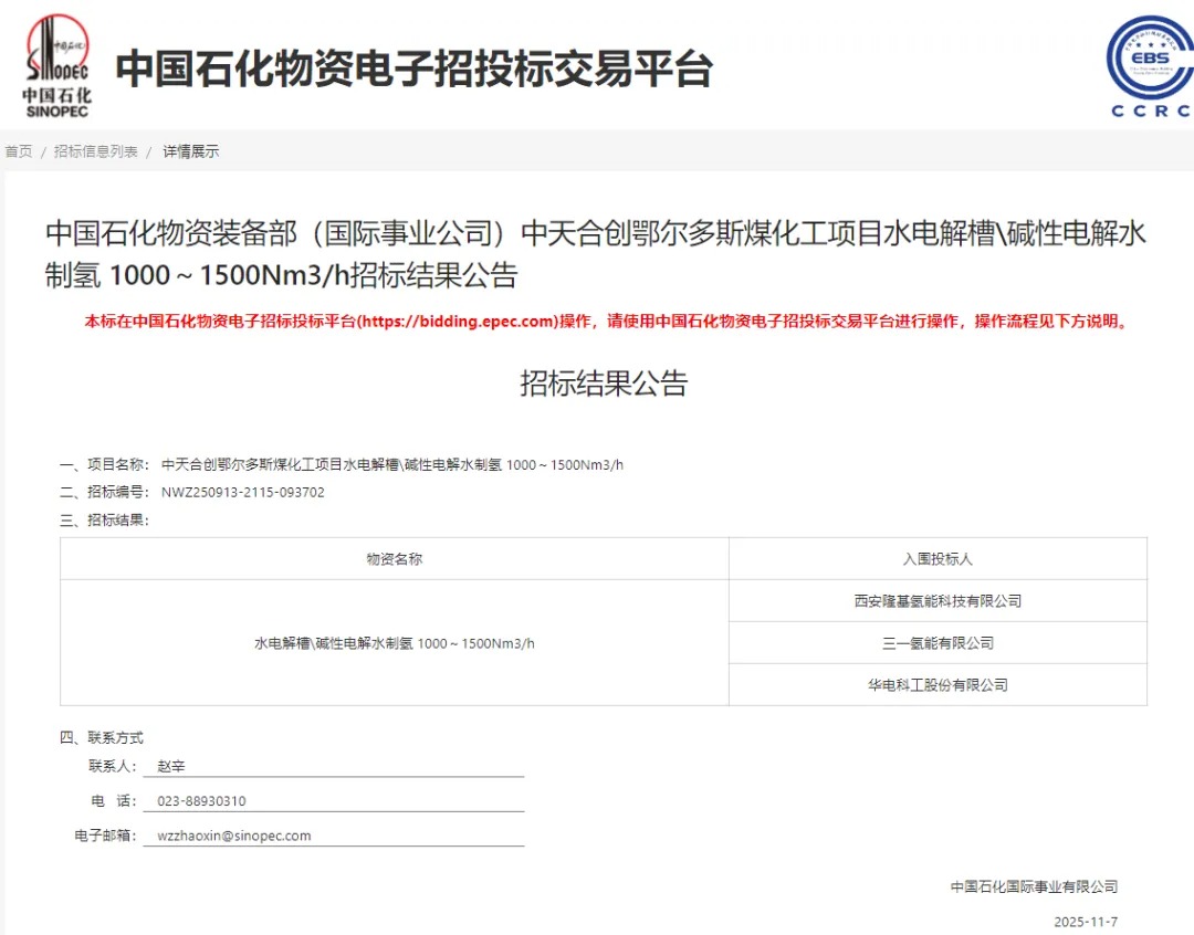 同時(shí),中國(guó)石化物質(zhì)電子招投標(biāo)交易平臺(tái)發(fā)布中國(guó)石化物資裝備部(國(guó)際事業(yè)公司)中天合創(chuàng)鄂爾多斯煤化工項(xiàng)目水電解槽\堿性電解水制氫 1000~1500Nm3/h招標(biāo)結(jié)果公告,隆基、三一、華電科工為入圍投標(biāo)人。