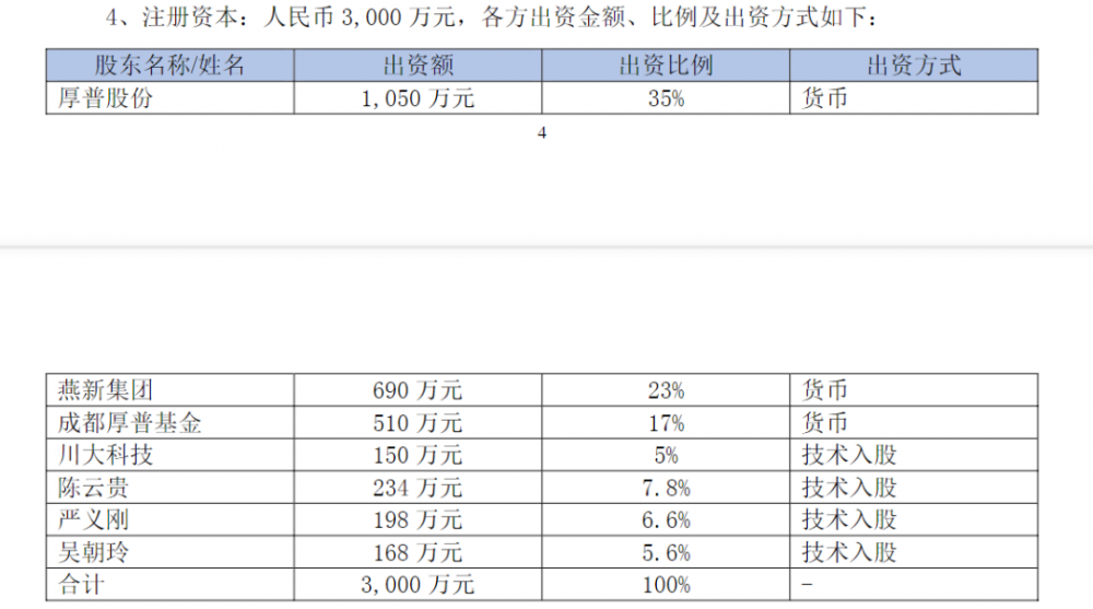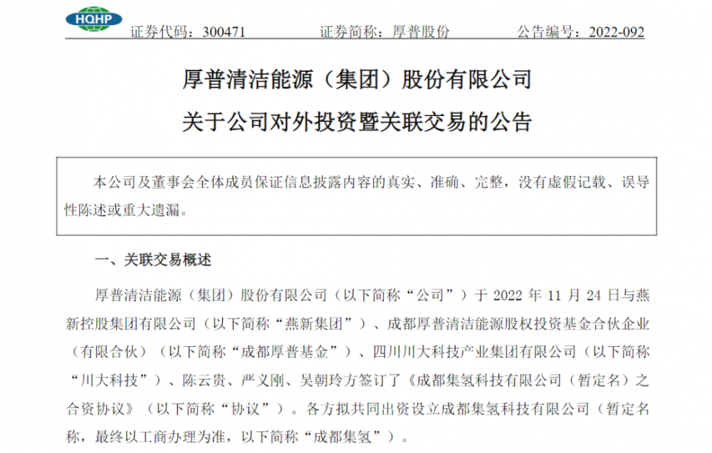 11月25日,厚普股份發布公告稱,11月24日,厚普股份與燕新集團、成都厚普基金、川大科技、陳云貴、嚴義剛、吳朝玲簽訂了《成都集氫科技有限公司(暫定名)之合資協議》。各方擬共同出資設立成都集氫科技有限公司(暫定名稱,簡稱“成都集氫”)。總投資3000萬元,其中厚普股份認繳1050萬元,持股比例為35%。