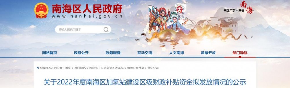 11 月 29 日,佛山南海區發改局發布了《關于 2022 年度南海區加氫站建設區級財政補貼資金擬發放情況的公示》。