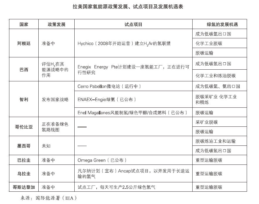 在氫能領域,拉美各國的發(fā)展情況和未來規(guī)劃處于不同階段。阿根廷、巴西、智利和哥倫比亞均發(fā)布了氫工業(yè)戰(zhàn)略,希望在未來幾年成為低碳氫出口國。墨西哥、巴拉圭和烏拉圭尋求使用氫能來使工業(yè)和交通脫碳,但尚未制定發(fā)展該行業(yè)的政治戰(zhàn)略。除了公共部門以外,私營部門也參與其中,例如阿根廷的H2Ar財團和智利的H2Chile。