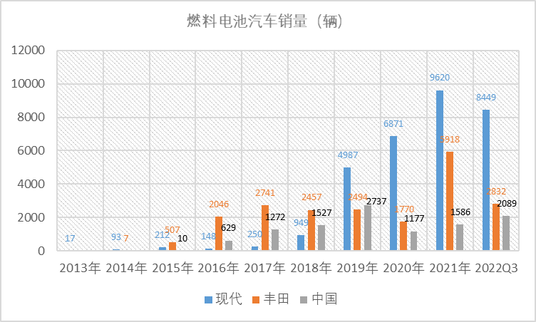 考慮到美國和歐洲目前主要的燃料電池汽車來源于進口(日本、韓國),我們暫且只比較韓國現代、日本豐田和中國的汽車銷量數據,韓國現代2013年-2022Q3累計銷售燃料電池汽車31596輛,日本豐田2014年-2022年Q3累計銷售燃料電池汽車20772輛,中國2015-2022年Q3累計銷售11027輛。韓國一家企業累計銷售是中國的近三倍,今年前三季度8449輛,是中國銷量的四倍。