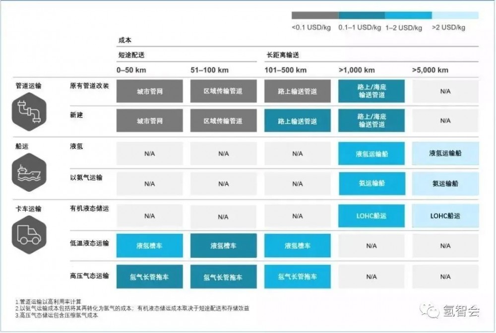 氫氣可以通過三個載體(管道、船舶或卡車)在世界各地以各種形式儲存和運輸(氫氣、液氫、有機液氫(LOHC)、氨、甲醇、LNG/L-CO2(LNG和液態CO2兩用船)和固態儲氫。在世界范圍內,氫氣儲運模式需要綜合運輸距離、地理位置和終端應用來確定最佳的儲運方案。