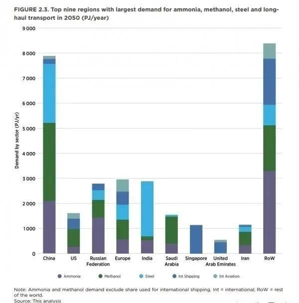 圖7 2050年氨、甲醇、鋼鐵和長途運輸需求量最大的九大地區