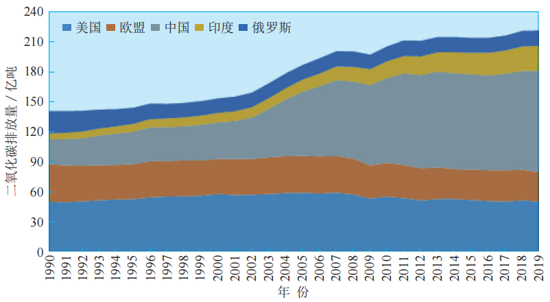 數(shù)據(jù)顯示,2013年我國碳排放達歷史高點之后曾一度出現(xiàn)下降,但之后隨著經(jīng)濟刺激政策實施以及經(jīng)濟增長動能增強,碳排放重新出現(xiàn)增長,到2019年排放總量達到98.3億噸(見圖1)。