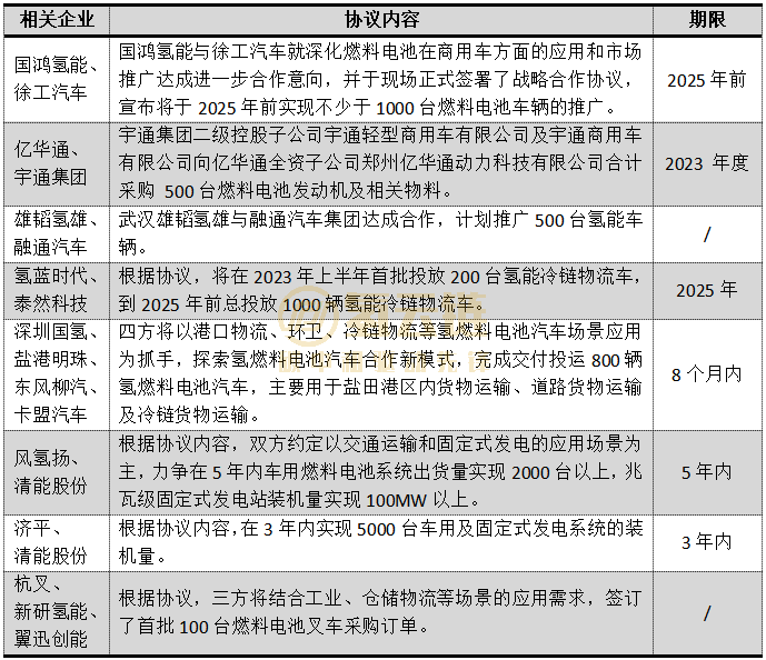 4、上游零部件供應商相關項目增多、規模大。2021年明確規模的項目主要是下游應用示范項目,2022年上游供應商的存在感大幅增加,且規模較大,如濟平與清能股份的5000臺套車用及氫發電燃料電池系統項目。