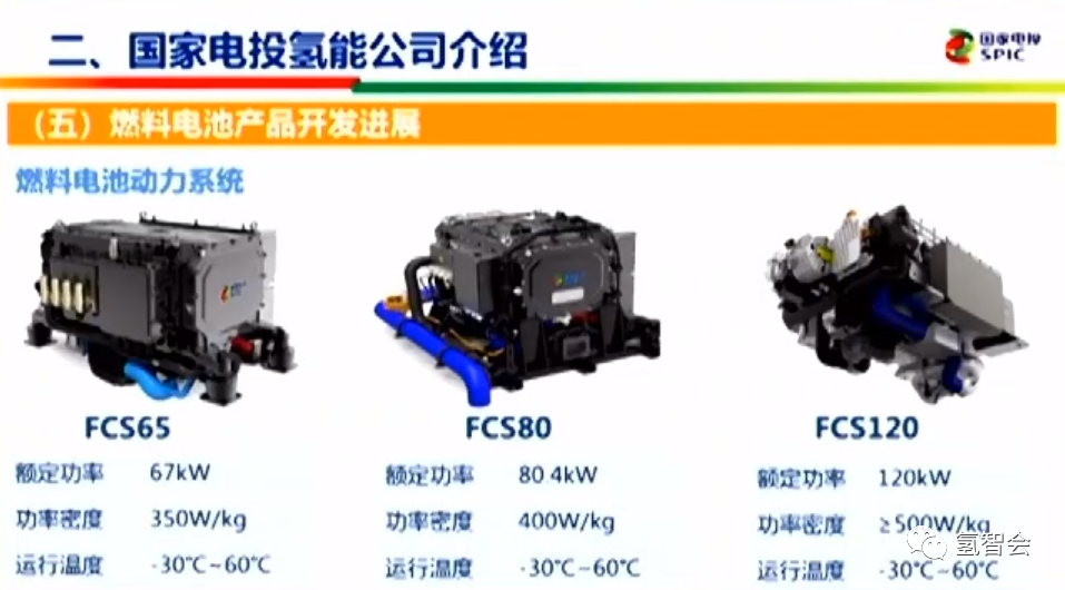 動力系統,我們現在,因為動力系統自己要用掉一部分的動力,所以我們現在根據上面三款燃料電池電堆,我們有65千瓦、80千瓦和120千瓦三款動力電池系統,分別用于我們的大巴車、我們的乘用車和我們未來的重卡等等,我們現在基本上都完成了這三款電堆的設計,當然對重卡我們可能是用FCS120的兩套系統來完成。