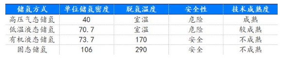 其中,加氫反應實現氫的儲存,脫氫反應實現氫的釋放,質量儲氫密度在 5%-10%,可以實現常溫常壓運輸,方便安全。但是儲氫載體的儲氫質量百分比意味著運輸相同質量的氫,載體的總質量會更大,而對于運輸過程而言,質量的重要性要高于體積,這是該方法的主要缺點。