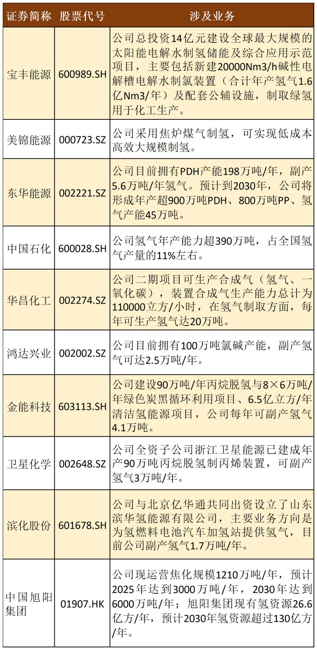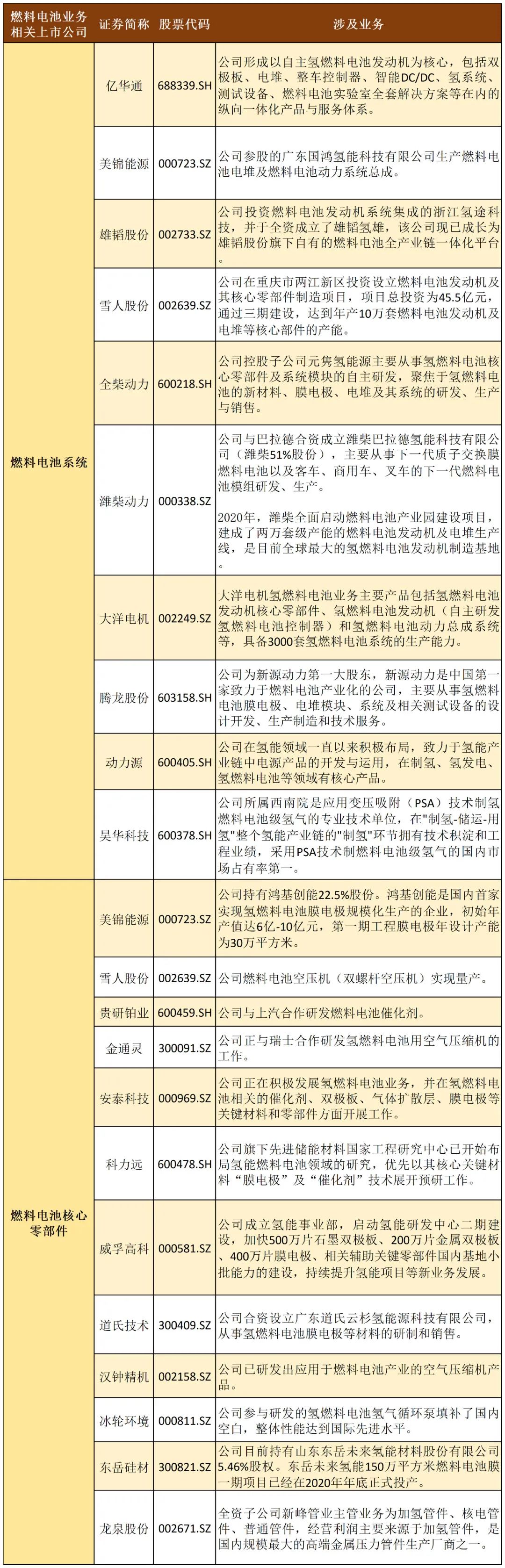 氫能產業鏈涉及多個核心部分。上游部分,主要包括制氫、儲運、加氫;中游部分,氫燃料電池及系統占據主導;下游部分,氫燃料電池汽車則成為終端應用發展的突破口。涉及相關上市公司如下: