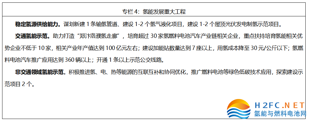 開展氫能示范應(yīng)用。充分發(fā)揮“鄭汴洛濮氫走廊”重要節(jié)點(diǎn)和“燃料電池汽車示范試點(diǎn)城市”雙重優(yōu)勢(shì),通過持續(xù)推進(jìn)氫能產(chǎn)業(yè)鏈條本地化、生產(chǎn)規(guī)模化、運(yùn)營(yíng)集約化,基本建立以工業(yè)副產(chǎn)氫、化石原料制氫和可再生能源制氫相結(jié)合的氫能供給體系,初步實(shí)現(xiàn)燃料電池八大關(guān)鍵零部件、基礎(chǔ)材料本地配套,基本補(bǔ)齊燃料電池汽車產(chǎn)業(yè)鏈短板,產(chǎn)業(yè)技術(shù)水平和創(chuàng)新能力進(jìn)一步提升,在氫氣制儲(chǔ)運(yùn)加、液氫裝備、整車制造、車輛示范應(yīng)用等領(lǐng)域?qū)崿F(xiàn)重點(diǎn)突破,打造“鄭汴洛濮氫走廊”氫能產(chǎn)業(yè)關(guān)鍵零部件研發(fā)制造高地,建成我省規(guī)模最大的氫能產(chǎn)業(yè)發(fā)展基地。